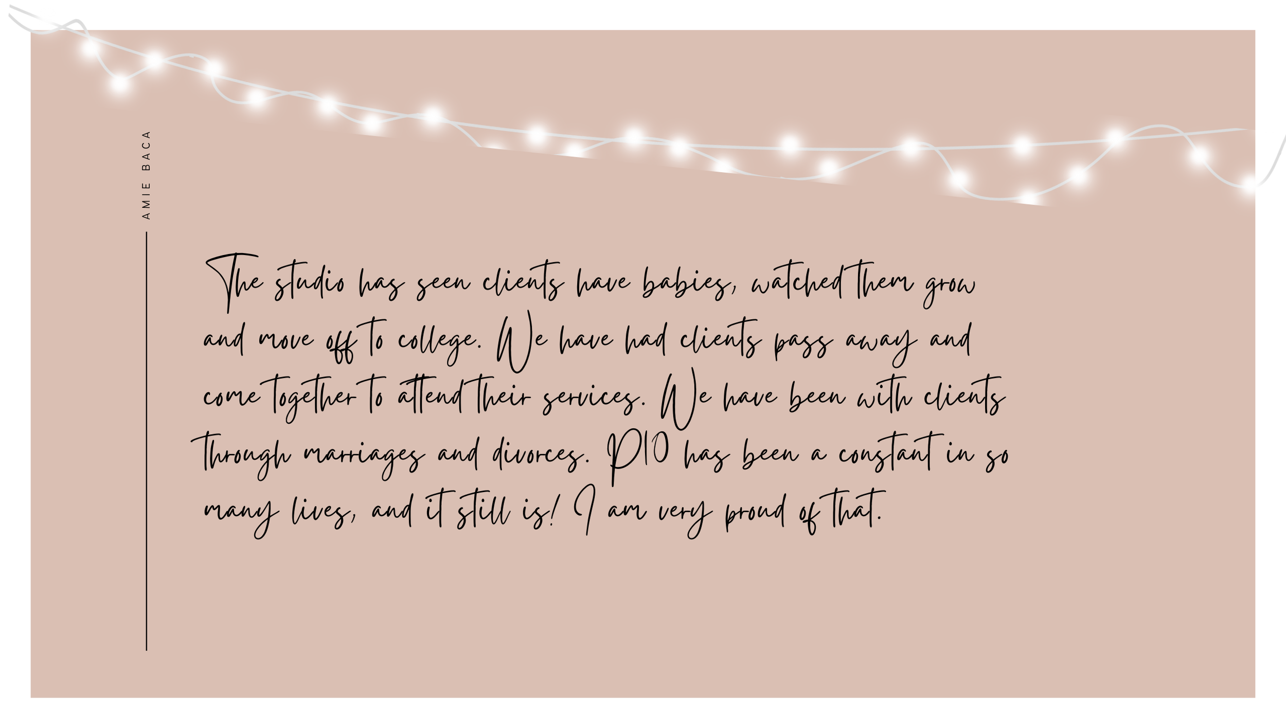 The studio has seen clients have babies, watched them grow and move off to college. We have had clients pass away and come together to attend their services. We have been with clients through marriages and divorces. P10 has been a constant in so many lives, and it still is! I am very proud of that.
